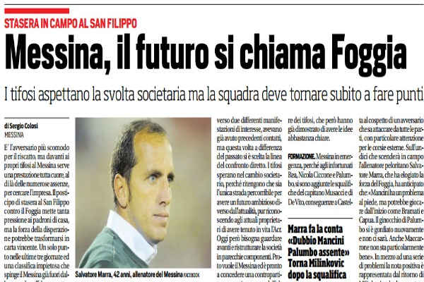 Corriere dello Sport: “Messina, il futuro si chiama Foggia. Stasera in campo al San Filippo. I tifosi aspettano la svolta societaria ma la squadra deve tornare subito a fare punti”