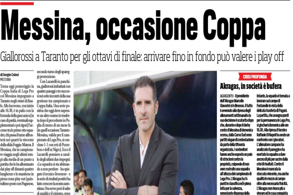 Corriere dello Sport: “Messina, occasione Coppa. Giallorossi a Taranto per gli ottavi di finale: arrivare fino in fondo può valere i play-off”