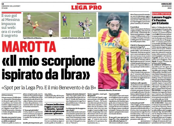 “Minuto numero 22 della ripresa, Alessandro Marotta guarda Berardi negli occhi e fiuta il pallone con l’istinto del bomber: colpisce di tacco, con la mossa dello scorpione, un po’ Higuita e un po’ Ibra. E’ il 5-0 del Benevento a Messina e il video del gol diventa subito virale sul web. Marotta, ma come le è venuto in mente di tentare il colpo dello scorpione? «Volevo la palla in avanti, tagliavo sul primo palo, ma Ciciretti me l’ha passata troppo indietro: ero sbilanciato, potevo prenderla solo di tacco. Un colpo d’istinto, doveva andare tutto alla perfezione. A Ciciretti ho detto: hai visto cosa m’hai fatto inventare?». E’ il suo gol più bello? «Certo, e pure in carriera ho avuto la fortuna di segnare parecchi gol belli. E’ di sicuro quello che ha fatto più rumore». Quello più importante, per ora, resta… «Nella finale play off che portò il Gubbio per la prima volta in C1, contro il San Marino. Feci un cucchiaio su rigore: è anche quello su Youtube…». Sorpreso da tanto clamore? «No, l’ho capito subito che il gol avrebbe fatto il giro dei social. E’ il bello del nostro torneo, finalmente la Lega Pro è più pubblicizzata. E il mio telefono è impazzito». La chiamata che ha apprezzato di più? «Si sono fatti sentire tanti amici incontrati in questi anni, tutti a dirmi: ma cosa hai combinato? Però l’emozione è stata sentire mio padre felice per aver visto il mio gol in tv, anche su “Striscia”». Tante squadre, tanti gol. Rimpianti? «Dal vivaio del Napoli a oggi, sono arrivato a 16 maglie e ho appena 29 anni… Per la prima volta resto più di due anni nella stessa squadra, e sono felice che sia accaduto a Benevento, dove vivo con mia moglie e i nostri tre figli. Forse l’unico rimpianto è non aver dimostrato tutto il mio valore quando sono stato a Bari: avessi avuto la testa che ho oggi… E’ stata la mia unica squadra in B, speriamo che la prossima sia…». I suoi modelli? «Ho pudore a fare certi nomi: se somigliassi a loro in qualcosa, sarei da un’altra parte. Da napoletano, dei Quartieri spagnoli, dico ovviamente Maradona. E poi amo Ibrahimovic, certi gol di tacco li fa soltanto lui: bisogna essere coordinati ed elastici. Diciamo che mi ha ispirato: quel gesto deve essermi rimasto dentro». Il suo gol è uno spot per la Lega Pro. Che campionato ci sta offrendo il girone C? «Un torneo molto più competitivo: l’anno scorso fu monotono, noi e la Salernitana; oggi ci sono parecchie squadre che lottano per la B. Oltre al Benevento, ci sono Foggia e Lecce, la sorpresa Casertana, il Cosenza». E tanti tifosi. «Vero: ci sono piazze che fanno migliaia di tifosi, roba che in B non si vede. A Benevento abbiamo tanti spettatori, a Foggia ci sono 15.000 persone, a Lecce 10.000. Ovunque c’è il calore della gente che ama la squadra della propria città». Club di A e B possono ancora pescare in Lega Pro? «Ci sono storie a sé, di chi è partito dalla C ed è arrivato in Nazionale. Ma di sicuro qui da noi ci sono tanti giovani forti, che non hanno avuto modo di emergere prima: molti sono almeno da B. Del resto, tolte le big che giocano per la A, tra noi e molte squadre del torneo cadetto non c’è grande differenza, e questo per merito nostro». Faccia un nome, allora. «Dico Ciciretti, il mio uomo assist. E’ cresciuto nella Roma e finalmente sta dimostrando il suo valore, ha raggiunto la maturità ed è già a 6 gol». Andiamo sulle squadre. «Il mio Benevento è molto forte. Abbiamo avuto delle difficoltà, tanti infortuni che non ci hanno permesso di lavorare al meglio all’inizio. Però abbiamo capito il lavoro di Auteri e siamo competitivi: possiamo fare qualcosa di importante, ma non lo diciamo…». Le favorite per la B? «Dico Foggia, perché mi piace molto come gioca e il progetto che porta avanti da due anni, e il Lecce, che è una piazza che non può stare in Lega Pro e ha investito tanto, e che è in crescendo dopo il cambio di allenatore. Almeno spostiamo la pressione sulle altre…»”. Questa l’intervista a Marotta realizzata dall’edizione odierna de “Il Corriere dello Sport”.