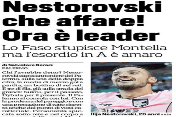“Chi l’avrebbe detto? Nestorowski capocannoniere del Palermo, sulla scia della doppia cifra, la media di mezzo gol a partita, un bottino di sei reti. E tre di fila, già sulla strada deigrandi: Sukru, per il passato, Dybala per il presente. Il Palermo si consola con lui. Con la prodezza del pareggio e con una prestazione di tutto rispetto anche dal punto di vista caratteriale. Personalità spiccata sotto rete e nel corpo a corpo con i difensori. Un altro giocatore rispetto alle critiche di avvio stagione quando lo chiamavano “Nestoro…chi?”. Per prenderlo in giro, per dire che era nel campionato italiano. Invece il macedone è già un affare per Zamparini. E il Palermo nelle sue mani. E nei piedi dell’unico vero bomber del gruppo, tanto che cinque dei sei punti conquistati portano la sua firma. Oggi le preghiere dei tifosi sono cambiate: speriamo che non si infortuni. Un acquisto il suo maturato in maniera singolare. Una scoria uguale a quella di Ilicic. Il Palermo aveva chiesto Bacinovic, poi scoprì sorprendenti qualità del compagno e prese entrambi. Stesso discorso con Nestorovski e con I’Inter Zapresic: trattative per Posavec e contratto per due, subito il portiere e qualche mese dopo il centravanti, costato appena 500 mila euro per un ingaggio che non arriva ai 200. Peccato che il gol contro il Milan non sia servito a ravvivare la fiducia della squadra e a ridare colore all’ambiente. Ma Nestoroveki c’è. Sempre di più”. Questo quanto riportato da “Il Corriere dello Sport”.