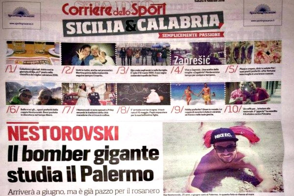 L’edizione odierna de “Il Corriere dello Sport” racconta Ilija Nestorovski attaccante macedone che arriverà a giugno, attraversole sue stesse parole. Ecco quanto si legge: “In frigo c’è Ilija Nestorovski, attaccante, compagno in nazionale di Trajkovski e fino a pochi giorni fa di Posavec nell’Inter Zapresic – scrive il quotidiano – Si presenta con un carico di gol impressionante. E di referenze positive. Nella prima parte dell’attuale stagione, 19 partite e 13 gol; l’anno scorso, 27 partite e 24 gol, e ancora prima venti su trenta presenze per un totale di 57 reti in 76 incontri. Un bomber classico sul quale avevano messo gli occhi perfino il Manchester Unitede e lo Schalke”. Al Corriere l’attaccante rilascia anche qualche parola sulla sua nuova squadra, che però raggiungerà a giugno: «Arrivo in una società che ha lanciato fior di campioni: Cavani, Pastore, Dybala.Ho fatto gavetta, provato, realizzato un mucchio di gol e mi sento pronto. Quando ho visto il contratto non ci credevo. Olanda e Belgio mi offrivano di più ma il mio sogno era approdare in serie A. So che il Palermo mi guarda e mi allenerò nel migliore dei modi per non deluderlo. Più vedo le partite del Palermo e più mi innamoro della maglia rosanero. Tutti mi chiedono se il Palermo è il mio punto di arrivo – continua il giocatore -. Ogni giocatore punta al pieno dei propri sogni, altrimenti perché scenderebbe in campo? L’ambizione è quella di proiettarmi sempre più in alto. La mia carriera è solo all’inizio. Gilardino è un grande attaccante, sarà difficile trovare spazio, sarà una bella lotta, ma sono discorsi che verranno»”.