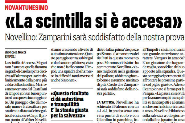 “La scintilla si è accesa. Magari non è ancora quella fiamma in grado di dare la spinta decisiva al Palermo per uscire definitivamente dalla parte più calda della classifica. Ma i rosanero tornano dal Castellani di Empoli con un buon punto ed una prova incoraggiante. Un pareggio che dà morale, muove la classifica e per ora tiene a distanza le inseguitrici Frosinone e Carpi. Il primo punto di Walter Novellino, dopo la sconfitta al debutto col Napoli. Il tecnico contro l’Empoli aveva chiesto una scintilla per invertire una pericolosa tendenza di risultati. «La scintilla c’è stata, il Palermo è stato bene in campo, abbiamo concesso poco e siamo riusciti anche a ripartire – dice l’allenatore rosanero – potevamo sfruttare meglio alcune situazioni che potevamo diventare delle occasioni da gol, ma stiamo crescendo a livello di autostima e attenzione. Questo pareggio senza subire gol ci darà ancora più forza, visto che non è facile contro l’Empoli, una squadra che ha messo in difficoltà tanti avversari anche blasonati». La mentalità. Un Palermo compatto e ordinato, bravo a inibire l’Empoli che non è riuscito a esprimere il suo gioco spettacolare fatto di possesso palla e fraseggi. Forse in alcune situazioni la paura di un’altra sconfitta e le necessità di fare risultato ha un po’ condizionato il Palermo in fase offensiva. Alla mezz’ora sono arrivate anche due palle-gol una dietro l’altra, prima Vasquez e poi Struna. «La mancanza dei risultati in questo momento pesa. Ma sono soddisfatto – ha commentato Novellino – siamo migliorati nella gestione del pallone, abbiamo giocato bene e avremmo meritato di più. Credo che Zamparini sarà soddisfatto della nostra partita». La tattica. Novellino ha schierato il Palermo con un 4-1-4-1, in pratica senza una vera punta di ruolo e con Gilardino in panchina, insieme a Djurdjevic e Balogh. Vazquez davanti da finto centravanti con due esterni d’attacco pronti a buttarsi dentro. Una schema che dà i suoi frutti, soprattutto Jajalo davanti alla difesa ad irretire Sapanora che viene annullato Il modulo? Lo avevamo già provato col Napoli nel secondo tempo, tutti i reparti hanno interpretato bene la gara, dovevamo concedere poco all’Empoli e ci siamo riusciti con grande attenzione e carattere. Vazquez in attacco? E’ un giocatore che ha grande voglia, sono felice del suo apporto alla squadra. Questo pareggio ci permetterà di affrontare le prossime partite col piglio giusto». Adesso il campionato si ferma per la Pasqua. «La pausa ci servirà per lavorare con più tranquillità su tanti aspetti e allenarsi anche con i calciatori rimasti a casa». Novellino è fiducioso sulla salvezza a otto giornate dalla fine (quattro in casa e quattro fuori). «Abbiamo grande qualità e questo aspetto mi dà fiducia. E’ chiaro che bisogna continuare a lottare e fare punti. Questo pareggio è un’iniezione di fiducia che ci permette di affrontare le prossime partite col piglio giusto». Dopo la sosta ancora in viaggio, al Bentegodi col Chievo, poi Lazio in casa e allo Stadium con la Juve”. Queste le dichiarazioni di Novellino analizzate dall’edizione odierna de “Il Corriere dello Sport”.