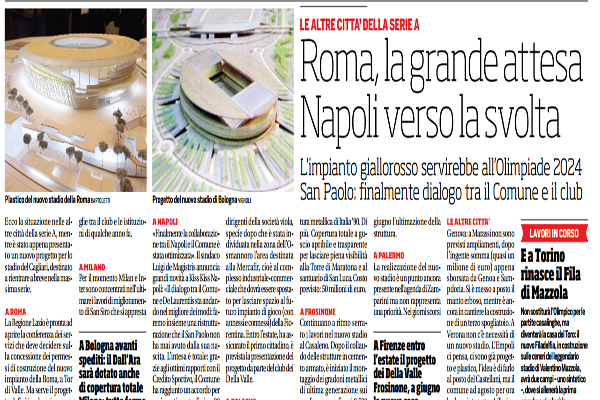 “Ecco la situazione nelle altre città della serie A, mentre è stato appena presentato un nuovo progetto per lo stadio del Cagliari, destinato a rientrare a breve nella massima serie. A ROMA La Regione Lazio è pronta ad aprire la conferenza dei servizi che deve decidere sulla concessione dei permessi di costruzione del nuovo impianto della Roma, a Tor di Valle. Ma serve il progetto definitivo, la cui presentazione è stata rinviata più volte. Il costruttore Luca Parnasi, partner del club nell’iniziativa, e la Roma stessa contano di completare i documenti a fine gennaio. Se questo avverrà, cominceranno a decorrere i 180 giorni previsti dalla legge per l’esame finale. Il nuovo stadio dovrebbe entrare tra gli impianti olimpici di Roma 2024. Sul fronte Lazio è tutto fermo, dopo le schermaglie tra il club e le istituzioni di qualche anno fa. A MILANO Per il momento Milan e Inter sono concentrati nell’ultimare i lavori di miglioramento di San Siro che si appresta ad ospitare la finale di Champions League 2016. Poi le due società torneranno a discutere sul destino dell’impianto che, se il Milan fosse riuscito nell’impresa di avere uno stadio di proprietà, sarebbe stato gestito integralmente dall’Inter. Ma c’è la sensazione che rossoneri e nerazzurri dovranno convivere ancora per qualche tempo.A NAPOLI «Finalmente la collaborazione tra il Napoli e il Comune è stata ottimizzata». Il sindaco Luigi de Magistris annuncia grandi novità a Kiss Kiss Napoli: «Il dialogo tra il Comune e De Laurentiis sta andando nel migliore dei modi: faremo insieme una ristrutturazione che il San Paolo non ha mai avuto dalla sua nascita. L’intesa è totale: grazie agli ottimi rapporti con il Credito Sportivo, il Comune ha raggiunto un accordo per un investimento di circa 20 milioni di euro da impiegare per una parte dei lavori, che avranno luogo in tempi molto rapidi, e parallelamente il presidente del Napoli potrà agire su altri fronti con altri investimenti». In sintesi, divisione di compiti e impegni economici condivisi. A FIRENZE Continui i contatti tra l’amministrazione comunale guidata dal sindaco Nardella e i dirigenti della società viola, specie dopo che è stata individuata nella zona dell’Osmannoro l’area destinata alla Mercafir, cioè al complesso industriale-commerciale che dovrà essere spostato per lasciare spazio al futuro impianto di gioco (con annessi e connessi) della Fiorentina. Entro l’estate, ha assicurato il primo cittadino, è prevista la presentazione del progetto da parte del club dei Della Valle. A BOLOGNA Entro dieci giorni il Bologna presenterà la relazione stilata dell’architetto Gino Zavanella e dal Comune alla Sovrintendenza per il sì ai lavori. Dopo il restyling parziale di quattro mesi fa (4 milioni di euro: nuovi seggiolini, spogliatoi e sala stampa), nel giro di 4 anni la capienza del Dall’Ara sarà ridotta a 25 mila posti. Il progetto comprende l’avvicinamento delle curve e l’eliminazione della struttura metallica di Italia ‘90. Di più. Copertura totale a guscio apribile e trasparente per lasciare piena visibilità alla Torre di Maratona e al santuario di San Luca. Costo previsto: 50 milioni di euro. A FROSINONE Continuano a ritmo serrato i lavori nel nuovo stadio al Casaleno. Dopo il collaudo delle strutture in cemento armato, è iniziato il montaggio dei gradoni metallici di ultima generazione sui quali verranno fissati 8.500 sedili colorati, con prevalenza del giallo e dell’azzurro. Potendo ospitare la vecchia e ristrutturata tribuna da 4.000 posti la capienza salirà a 12.500. La consegna dei lavori, di competenza comunale, avverrà a fine febbraio. Toccherà poi al privato, che si aggiudicherà l’appalto in concessione per 50 anni, completare l’impianto realizzando, tra l’altro, altri 4.000 posti. Prevista per giugno l’ultimazione della struttura. A PALERMO La realizzazione del nuovo stadio è un punto ancora presente nell’agenda di Zamparini ma non rappresenta una priorità. Nei giorni scorsi il sindaco Orlando ha inviato al patron rosanero una lettera ribadendo la disponibilità della giunta a valutare un nuovo progetto (purché conforme alla normativa vigente) da parte della società. Orlando aspetta da Zamparini una risposta che, in attesa di individuare i canali di finanziamento, deve essere ancora formulata. LE ALTRE CITTA’ Genova: a Marassi non sono previsti ampliamenti, dopo l’ingente somma (quasi un milione di euro) appena sborsata da Genoa e Sampdoria. Si è messo a posto il manto erboso, mentre è ancora in cantiere la costruzione di un terzo spogliatoio. A Verona non c’è necessità di un nuovo stadio. L’Empoli ci pensa, ci sono già progetto e plastico, l’idea è di farlo al posto del Castellani, ma il comune ad agosto per ora ha bocciato tutto. A Torino sono a posto sia Juve sia Toro, il Sassuolo ha fatto suo lo stadio di Reggio Emilia diventato Mapei Stadium. A Bergamo l’“Atleti azzurri d’Italia” ha appena subito un importante restyling. Il Carpi si è appoggiato al Braglia di Modena (accordo di due anni più uno di opzione) perché lo stadio Cabassi non può essere portato a norma”. Questo quanto riportato sull’edizione odierna de “Il Corriere dello Sport”.