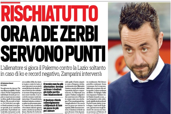 Corriere dello Sport: “Ora a De Zerbi servono punti. L’allenatore si gioca il Palermo contro la Lazio: in caso di nuovo ko Zamparini interverrà…”