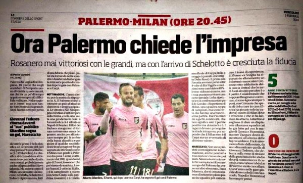 “Rosanero mai vittoriosi con le grandi, ma con l’arrivo di Schelotto è cresciuta la fiducia”. Questo quanto scrive l’edizione odierna de “Il Corriere dello Sport”, in merito al match in programma questa sera tra Palermo e Milan: “Palermo ha voglia di un’impresa – continua il quotidiano – di quelle che negli anni d’oro di Zamparini erano quasi comuni ma che da un po’ di tempo appaiono sempre più difficili da realizzare. Nella stagione in corso i rosa non hanno battuto nessuna grande. Anzi, hanno sempre contro le prime 7 della classifica ad eccezione del pari strappato all’Inter al “Barbera”. Stasera contro il Milan Schelotto e Tedesco ci proveranno, forti di una fiducia che pian piano sta tornando nella squadra e desiderosi di allungare la mini serie positiva dopo Udinese e Carpi […]”