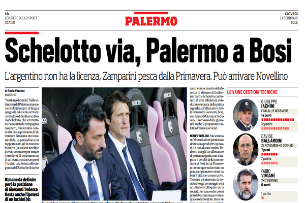 Corriere dello Sport: “Palermo a Bosi. Può arrivare Novellino e non si esclude il ritorno di Iachini, gli slavi dietro l’addio di Schelotto?”