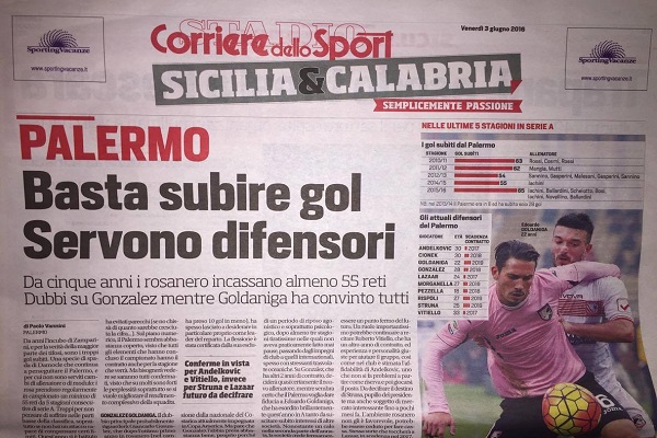 “Da anni l’incubo di Zamparini, e per la verità della maggior parte dei tifosi, sono i troppi gol subiti. Una specie di spada di Damocle che continua a perseguitare il Palermo, e per cui non sono serviti cambi di allenatore o di modulo: i rosa prendono regolarmente in campionato un minimo di 55 reti da 5 stagioni consecutive di serie A. Troppi per non pensare di soffrire nelle parti basse della classifica, soprattutto se non hai un attacco capace di compensare certi limiti. Quest’anno si è battuto il record negativo in materia, con 65 reti al passivo. Due in più della famosa stagione con Delio Rossi in panchina che provocò notevoli polemiche col patron infuriato per la debolezza nel reparto arretrato. DA COSA SI RIPARTE Dunque, il lavoro sulla difesa dovrà essere una delle basi del mercato che verrà, pur con gli interrogativi che al momento accompagnano lo staff rosanero. Non si sa ancora infatti chi sarà l’allenatore e quale tipo di gioco vorrà impostare. Ma dicerto l’obiettivo dovrà essere scendere sotto i 60 gol che di media negli ultimi anni hanno caratterizzato il Palermo […]. Il dubbio principale probabilmente riguarderà Giancarlo Gonzalez, che dopo l’ottimo primo anno in rosanero ha spesso lasciato a desiderare in particolare proprio come leader del reparto. La flessione è stata certificata dalla sua esclusione dalla Nazionale del Costarica attualmente impegnata in Copa America. Sul suo futuro deciderà sicuramente il nuovo allenatore, mentre sembra certo che il Palermo voglia dare fiducia a Edoardo Goldaniga, che ha esordito brillantemente quest’anno in A tanto da suscitare subito interesse di altre società. […]. Un ruolo importantissimo potrebbe continuare a recitare Vitiello, che ha un altro anno di contratto, ed esperienza e personalità giuste per aiutare il gruppo, così come nel club è stimata l’affidabilità di Andelkovic. Da decifrare il destino di Struna, pupillo del presidente ma anche soggetto di mercato interessante fino a pochi mesi fa. L’ambiente rosanero non gli è favorevole, potrebbe essere ceduto per fare cassa. Stessa sorte che toccherà a Lazaar”. Questo quanto si legge sull’edizione odierna de “Il Corriere dello Sport”.