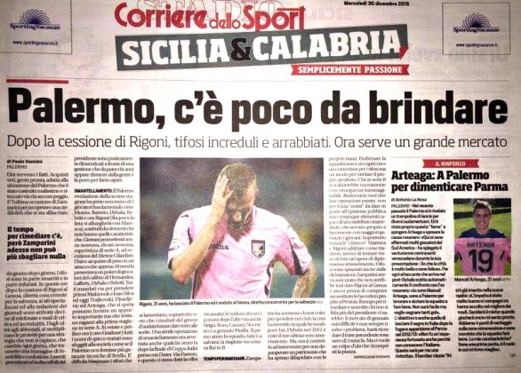 “Palermo, c’è poco da brindare. Dopo la cessione di Rigoni, tifosi increduli e arrabiati. Ora serve un grande mercato”. Così titola l’edizione odierna de “Il Corriere dello Sport” in merito alla cessione di Rigoni e alle mosse che il Palermo dovrà fare nel mercato invernale: “Ora servono i fatti. Acquisti veri, gente pronta, adatta alla situazione del Palermo che è stato costruito malissimo e ritoccato via via ancora peggio. E’l’ultima occasione di Zamparini per recuperare una credibilità che si sta sfilacciando giorno dopo giorno. I tifosi sono in parte smarriti e in parte infuriati. In queste ore dopo la cessione di Rigoni al Genoa, diretta concorrente per la salvezza. Dagli ultrà agli abbonati, si moltiplicano le proteste per una strategia che non si capisce, che cambia ogni giorno, che trasmette una immagine di instabilità e confusione. Il Palermo rivelazione della scorsa stagione ha perso non meno di cinque giocatori fondamentali come Munoz, Barreto, Dybala, Belotti e Rigoni, sostituiti da elementi che non hanno le stesse caratteristiche. Giovani promettenti senza nessuna esperienza in serie A ad eccezione di Gilardino. […] Zamparini ha ammesso di non voler più spendere nel club ma ora è costretto ad intervenire per non depauperare un patrimonio che ha spesso dilapidato con le proprie mani. Rinforzare la squadra non è un capriccio o un contentino per i tifosi, ma un modo per tutelare il proprio prodotto. Che in serie B si svaluterebbe nuovamente con conseguenze inimmaginabili. Rinforzarla vuol dire fare operazioni mirate, non per forza nomi da dare in pasto all’opinione pubblica ma comunque elementi capaci di un contributo immediato, che servano proprio a far crescere con maggiori garanzie i giovani. Soprattutto senza le chioccie Maresca e Rigoni. Il mercato di gennaio sarà difficile e non sempre risolve i problemi, basti ricordare il triste precedente rosanero di tre anni fa. Ma ci vuole un colpo d’ala che riconquisti la piazza”.