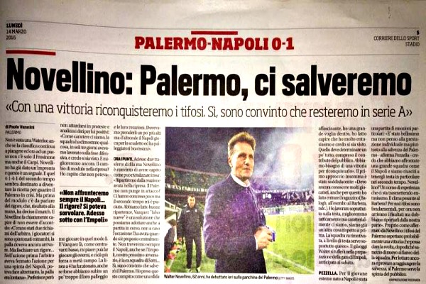 «Si, sono convinto che resteremo in serie A, con una vittoria conquisteremo i tifosi». Non è stata una Waterloo anche se la classifica continua a piangere ed ora ad un passo non c’è solo il Frosinone ma anche il Carpi. Novellino ha già dato un’impronta e questo è un segnale. E quel 4-1-4-1 del secondo tempo sembra destinato a diventare la ricetta per guarire il Palermo in crisi. Ma prima del modulo, bisogna parlare del rigore, che, risultato alla mano ha deciso la gara. E Novellino fa chiaramente capire di non essere d’accordo: «C’erano stati due richiami dall’arbitro, i giocatori si sono spintonati entrambi, la palla doveva ancora arrivare. Ma fischiare un rigore…Nell’azione prima l’arbitro aveva fermato l’azione per una spinta del Napoli, poteva fare altrettanto, la palla era lontana». Preferisce però non attardarsi in proteste e analizza i dati per lui positivi: «Come carattere ci siamo, la squadra ha dimostrato qualcosa, in soli tre giorni avevamo lavorato sulla fase difensiva, e credo si sia visto. E miglioreremo ancora. Il cambio modulo nella ripresa? Ho capito che non potevamo giocare in quel modo lì. E Vazquez là, come centravanti basso, mi piace far giocare gli esterni e ci da più forza a centrocampo, la linea a 4 ha funzionato» […]”. Queste le parole di Walter Novellino rilasciate dopo Palermo-Napoli e analizzate oggi da “Il Corriere dello Sport”.