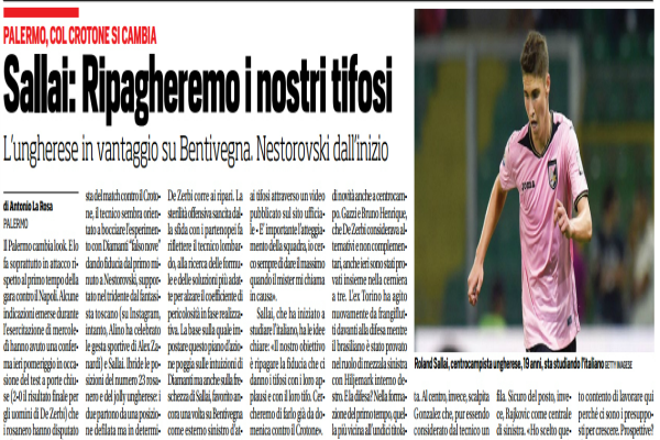 “Il Palermo cambia look. E lo fa soprattutto in attacco rispetto al primo tempo della gara contro il Napoli. Alcune indicazioni emerse durante l’esercitazione di mercoledì hanno avuto una conferma ieri pomeriggio in occasione del test a porte chiuse (2-0 il risultato finale per gli uomini di De Zerbi) che i rosanero hanno disputato al “Tenente Onorato” contro la formazione Under 17. Due indizi possono bastare per formare una prova: in vista del match contro il Crotone, il tecnico sembra orientato a bocciare l’esperimento con Diamanti “falso nove” dando fiducia dal primo minuto a Nestorovski, supportato nel tridente dal fantasista toscano (su Instagram, intanto, Alino ha celebrato le gesta sportive di Alex Zanardi) e Sallai. Ibride le posizioni del numero 23 rosanero e del jolly ungherese: i due partono da una posizione defilata ma in determinate circostanze sono chiamati a “stringersi” vicino alla prima punta trasformando il 4-3-3 iniziale in un 4-3-2-1. De Zerbi corre ai ripari. La sterilità offensiva sancita dalla sfida con i partenopei fa riflettere il tecnico lombardo, alla ricerca delle formule e delle soluzioni più adatte per alzare il coefficiente di pericolosità in fase realizzativa. La base sulla quale impostare questo piano d’azione poggia sulle intuizioni di Diamanti ma anche sulla freschezza di Sallai, favorito ancora una volta su Bentivegna come esterno sinistro d’attacco. «Non è importante il modulo, tre punte oppure due – ha puntualizzato il talento magiaro rispondendo ai tifosi attraverso un video pubblicato sul sito ufficiale – E’ importante l’atteggiamento della squadra, io cerco sempre di dare il massimo quando il mister mi chiama in causa». Sallai, che ha iniziato a studiare l’italiano, ha le idee chiare: «Il nostro obiettivo è ripagare la fiducia che ci danno i tifosi con i loro applausi e con il loro tifo. Cercheremo di farlo già da domenica contro il Crotone». LAVORI IN CORSO. Rispetto alla prima frazione di gioco della gara con il Napoli soffia aria di novità anche a centrocampo. Gazzi e Bruno Henrique, che De Zerbi considerava alternativi e non complementari, anche ieri sono stati provati insieme nella cerniera a tre. L’ex Torino ha agito nuovamente da frangiflutti davanti alla difesa mentre il brasiliano è stato provato nel ruolo di mezzala sinistra con Hiljemark interno destro. E la difesa? Nella formazione del primo tempo, quella più vicina all’undici titolare, come terzino destro nella linea a quattro ha agito Vitiello al posto di Rispoli che non ha preso parte alla partita. Al centro, invece, scalpita Gonzalez che, pur essendo considerato dal tecnico un titolare a tutti gli effetti, dovrà superare la concorrenza di Goldaniga per riconquistare una poltrona in prima fila. Sicuro del posto, invece, Rajkovic come centrale di sinistra. «Ho scelto questo club perché ci sono calciatori giovani ma forti – ha sottolineato il serbo a Tuttomercatoweb – sono molto contento di lavorare qui perché ci sono i presupposti per crescere. Prospettive? L’inizio non è stato semplice ma c’è tutta una stagione da giocare».”. Questo quanto si legge sull’edizione odierna de “Il Corriere dello Sport”.