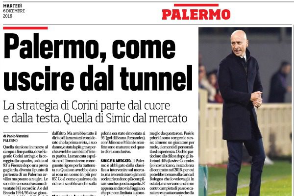 “Quella riunione in mezzo al campo a fine partita, dove Eugenio Corini arringa e fa coraggio alla squadra, caduta al 93’ a Firenze dopo una prova gagliarda, diventa il punto di partenza di un Palermo avvilito ma pronto a reagire. Le sconfitte consecutive sono diventate 8 (il record in A è del Brescia 1994/95 dove giocava Corini, 15 ko di fila), c’è il rischio che prenda il sopravvento lo scoramento. Ma il nuovo allenatore è pronto a suonare la carica: la gara del Franchi ha in fondo indicato che il Palermo ha mezzi e cuore per venire fuori dal periodo nerissimo. Quel modo di parlare al gruppo è stato il segnale di incitamento e rinnovata fiducia che anche i tifosi hanno colto e apprezzato. La distanza col quart’ultimo posto, 4 punti, è rimasta invariata. Le prossime 4 gare che chiuderanno il girone d’andata, contro Chievo, Genoa, Pescara e Empoli, sono quelle a cui si chiede la svolta. Episodi no. Il Palermo non è scaduto nelle polemiche per una gara arbitrata malissimo e densa di errori da un lato e dall’altro. Ma avrebbe tutto il diritto di lamentarsi considerato che la prima svista, a suo danno, è stata la più grave perché avrebbe cambiato l’intera partita. La mancata espulsione di Tomovic con conseguente rigore per la trattenuta su Quaison avrebbe dato ai rosa un uomo in più per 85.’ Così come qualcosa da ridire ci sarebbe anche sulla meccanica del gol di Babacar con Kalinic che ostacola Pezzella. Più in generale, nelle ultime 53 partite al Palermo è stato concesso appena un rigore a favore (con l’Atalanta nella scorsa stagione) e nelle ultime giornate parecchi episodi sono apparsi discutibili: a Cagliari la mano di Isla non vista, col Milan due interventi sospetti su Nestorovski. Allo stesso modo, il Palermo deve rimproverare se stesso per aver perso molti punti nelle fasi finali delle gare: già a Genova con la Sampdoria era stato rimontato al 95’ (gol di Bruno Fernandes), con Udinese e Milan le sconfitte sono maturate nel quarto d’ora conclusivo”. Questo quanto riportato sull’edizione odierna de “Il Corriere dello Sport”.