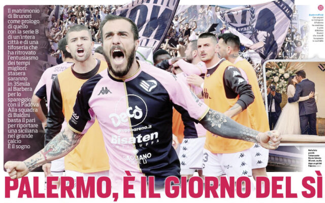 Il matrimonio di Brunori. Emozioni, dunque. Palermo si è reinnamorata di questa squadra proprio per la sua capacità di nutrirsi di esse ed esprimerle in gol. Baldini non ha lavorato solo sulle correzioni di modulo ma sulla condivisione di un sistema di valori che rafforzasse le motivazioni, individuali e collettive. La sua ribadita diversità rispetto agli standard degli uomini di calcio ha fatto breccia nella squadra che, una volta supportata dai risultati, non ha avuto più remore a sposare in pieno la filosofia, prima umana e poi applicata al campo, del proprio allenatore. L’ultimo, clamoroso esempio è di questa settimana: Matteo Brunori, il bomber, il giocatore forse più importante, venerdì si è sposato con la sua Dalila, al Castello di Naro nelle Marche, alla presenza anche di 3 compagni di squadra, Soleri, Massolo e Perrotta. La data era già fissata, non era possibile spostarla. Anomalo preparare così la partita clou della stagione? Non per Baldini, pienamente avallato dalla società, che hanno dato il permesso a Brunori, fornendo anche un charter per rientrare in serata a Palermo e svolgere ieri la normale rifinitura. «Il percorso va oltre al risultato» e la serenità interna di un calciatore è prevalente rispetto ai possibili scomodi di un viaggio. La maggior parte dei club avrebbe certamente chiesto di rinviare il matrimonio, il Palermo ha scelto un’altra strada. Ma è proprio questo spirito che finora ha dato ai rosa qualcosa in più. E che stasera trascinerà al Barbera una città tornata a credere in un sogno.