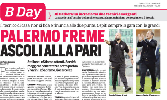 “Per la prima volta da quando guida il Palermo, Stellone stasera rinuncerà alle due punte. Nel turbinio di rotazioni di schemi ed uomini, con l’Ascoli il tecnico si adeguerà al periodo schierando i rosa con l’albero di Natale (4-3-2-1). Ma i motivi ci sono tutti, a cominciare dalla necessità di pensare anche alla successiva delicata trasferta di Cittadella, distante appena 60 ore, e di avere un attaccante di ruolo (in questo caso Puscas, escluso inizialmente) che dalla panchina possa dare una svolta se occorre. L’Ascoli è temibile soprattutto contro le grandi (“ha battuto Lecce, Verona e Benevento e pareggiato a Pescara” ammonisce Stellone) per cui stavolta il Palermo pensa a rinforzare la linea mediana, inserendo due elementi freschi come Haas e Chochev accanto a Jajalo e tenendo sulle trequarti Trajkovski e Falletti, pronti a diventare a loro volta attaccanti di supporto a Moreo. IL PIZZICOTTO. Stellone non si spaventa per la rimonta del Brescia che ieri ha aűancato il Palermo né ritiene la sua squadra in flessione. Ma un pizzicotto ai suoi che devono tornare alla vittoria al Barbera lo ha dato eccome: «Mi verrebbero dubbi sulle nostre qualità se soffrissimo troppo o creassimo poco; allora potrei pensare ad accorgimenti tattici o di interpreti. Ma al di là dei pareggi la squadra in ogni gara non dà segnali preoccupanti; calcia più dell’avversario e subisce meno. Allo stesso tempo, è vero che non perdiamo da 11 giornate ma negli ultimi tempi abbiamo raccolto meno di quanto potremmo, per cui serve un pizzico di concretezza in più in avanti perché con l’Ascoli vogliamo i 3 punti e non importa come. Il Brescia? Non facciamo la corsa su di loro, guardiamo gara dopo gara: il campionato non si vince adesso». IL DOPO STRUNA. Nella notte di Natale, il Palermo ha uffcializzato il già annunciato passaggio di Struna agli americani dello Houston Dynamo. 4 anni di contratto al difensore che era in scadenza, 650mila euro l’introito per il club. Stellone ha ribadito i suoi punti fermi sul mercato: «Un’operazione che ho condiviso, noi non tratteniamo nessuno. Struna era un discorso particolare, la società rischiava di perdere un possibile introito. Ad oggi non abbiamo pensato a un sostituto perché ora giochiamo spesso con la difesa a 4 e, oltre ai titolari, ci sono già Accardi, Ingegneri, Pirrello e Szyminski. Con Foschi parliamo la stessa lingua: non vogliamo toccare una squadra che ci ha portato al primo posto in classifica. Però, non terremo giocatori scontenti, dunque chi per un qualunque motivo, ha il desiderio di andar via, sarà rimpiazzato. L’ideale a fine mercato sarebbe avere due giocatori per ruolo ma non di più per non creare esuberi. Per adesso tutti si stanno allenando benissimo: in queste 2 partite voglio tutti concentrati solo sul campo. Poi vedremo il da farsi»”. Questo quanto analizzato dall’edizione odierna de “Il Corriere dello Sport”.