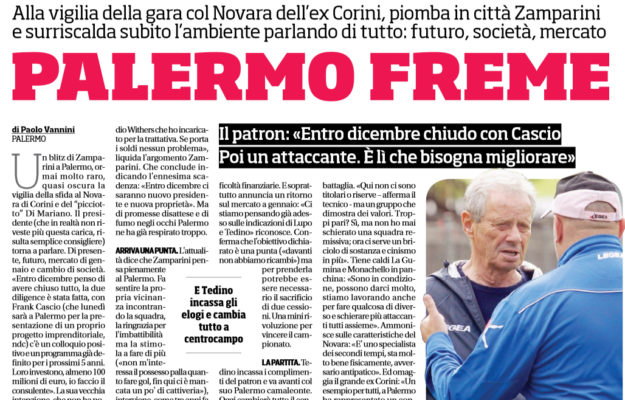 Corriere dello Sport: “Palermo freme. Il patron: «Entro dicembre chiudo con Cascio. Poi un attaccante. È lì che bisogna migliorare»”