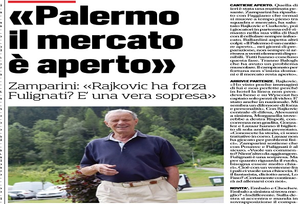 Corriere dello Sport: “«Palermo il mercato è aperto». Zamparini: «Rajkovic ha forza. Fulignati? E’ una vera sopresa»”