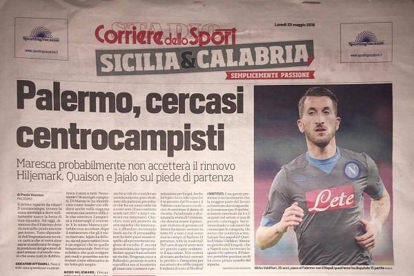 Nelle pagine del “Corriere dello Sport” oggi si parla soprattutto della situazione del centrocampo rosanero: sembra infatti che il mercato del Palermo si concentrerà principalmente su questo reparto. Il dirigente Gianni Di Marzio sostiene che siano necessari 4 o 5 acquisti di valore, dei leader di esperienza. Il nome che circola con maggiore insistenza è quello di Mirko Valdifiori, centrocampista 30enne ex gioiello dell’Empoli che ha trovato quest’anno poco spazio al Napoli. Analizzando infatti le situazioni dei singoli giocatori del centrocampo rosanero, ad oggi sembra che questo reparto sia tutto da rinnovare, tenendo anche in considerazione l’impostazione tecnico-tattica che si vorrà dare alla squadra per la prossima stagione. Maresca si è rivelato fondamentale per i rosanero e Di Marzio spinge perché al giocatore 36enne venga rinnovato il contratto, ma non si sa ancora né se Zamparini accetterà di fare questo passo, né se Maresca vorrà restare dopo le turbolente vicende della stagione appena conclusa. Jajalo e Chochev quest’anno hanno deluso sia tatticamente che sul piano della personalità. Lo svedese Oscar Hiljemark è un “pezzo pregiato” del mercato rosanero: ha un contratto fino al 2019 ma piace a molte squadre, soprattutto della Premiership inglese. L’altro svedese, Quaison, sembra destinato alla partenza per evitare che lasci il Palermo a costo zero fra un anno. L’uruguaiano Brugman piace molto al tecnico Ballardini, ma il giocatore è in prestito dal Pescara e ancora il Palermo non ha deciso se esercitare o no il diritto di riscatto. Cristante, che doveva essere il principale rinforzo del mercato di gennaio, è stato invece tra quelli che hanno giocato meno e difficilmente i rosanero pagheranno 6 milioni di euro al Benfica per riscattarlo.