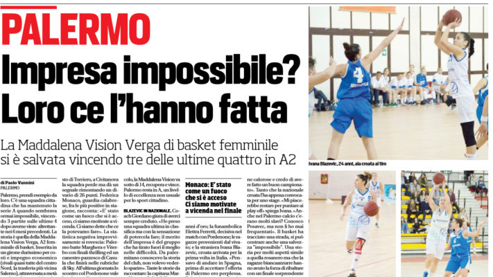 Corriere dello Sport: “Palermo, impresa impossibile? Loro ce l’hanno fatta. La Maddalena Vision Verga di basket femminile si è salvata vincendo tre delle ultime quattro in A2”