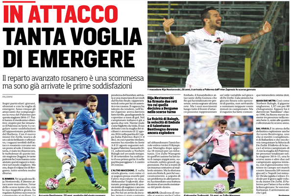 “Segni particolari: giovani, sfrontati e con la voglia di emergere. Sono cinque gli attaccanti che compongono la rosa del Palermo per questa stagione 2016-17. Tutti hanno il medesimo obiettivo: stupire per far rimanere il Palermo in Serie A e regalare tante soddisfazioni all’appassionato pubblico del Barbera. Con il nuovo mister De Zerbi, teorico di un calcio brillante e offensivo, i ragazzi terribili dell’attacco rosanero cercano ora un posto al sole. L’inizio tuttavia, è stato in chiaroscuro, le turbolenze di questo inizio stagione (leggasi, le tante polemiche) non hanno certo aiutato questi ragazzi a inserirsi nel modo migliore. Ma ora, dopo il colpaccio di Bergamo, tutto sembra molto diverso. IL BOMBER. Ne sa qualcosa Ilija Nestorovski, il 26enne attaccante macedone, l’eroe dello scorso turno che, con la sua magnifica girata, ha regalato il primo successo in campionato ai siciliani. La prodezza del bomber, arrivata a una manciata di secondi dal fischio finale, rappresenterà di certo per lui un autentico toccasana. Il ragazzo ha talento da vendere, nell’Inter Zapresic aveva davvero fatto faville, guadagnando le copertine a suon di gol. Nel campionato italiano è già a quota due reti. Niente male come biglietto da visita. Il suo debutto con la maglia dei siciliani è avvenuto il 12 agosto 2016 nella partita di Coppa Italia Palermo-Bari (1-0 dts), in cui è partito titolare, mentre ha esordito in Serie A il 21 agosto seguente nella gara Palermo-Sassuolo (0-1), subentrando a Norbert Balogh nel secondo tempo. Il 18 settembre ha realizzato il suo primo gol in A nella partita pareggiata 1-1 contro il Crotone. L’ALTRO MACEDONE. È sulla strada giusta, così come ci si augura possa esserlo per l’altro macedone in rosa, Aleksandar Trajkovski, sfortunato protagonista di questo inizio di stagione e ancora in attesa di scendere in campo. Per lui un avvio da incubo: prima è stato costretto ad abbandonare l’amichevole estiva contro l’Olympique Marsiglia dopo appena 18 minuti per un infortunio. L’ex Zulte Waregem in quell’occasione ha lasciato il campo zoppicante, suscitando subito grandi apprensioni. Per lui si trattò di un trauma contusivo al malleolo sinistro. Ma la sfortuna non era finita lì, perché successivamente, a seguito di un problema in allenamento, ha rimediato una frattura da stress al secondo metatarso del piede destro. VELOCITÀ. Qualcosa di meglio si augura anche Carlos Embalo, il funambolico attaccante della Guinea che fin qui ha totalizzato tre presenze, senza segnare alcuna rete. Ma i suoi movimenti lungo tutto il fronte d’attacco possono rappresentare un’utile variabile nel gioco di De Zerbi. L’ala sinistra ha giocato finora solo spezzoni di partita, non arrivando a sommare neppure cento minuti in campionato. Ma il ragazzo ha fatto comunque intravedere ottime doti. Così come QUASI DUE METRI. Norbert Balogh, il gigante ungherese, 1,97 cm per 80 chilogrammi. Eppure lui è davvero un “bambino” : classe 1996, ha finora messo insieme tre presenze nella nostra Serie A, unite alle quattro collezionate lo scorso anno. DAL VIVAIO. È in attesa della definitiva esplosione anche Accursio Bentivegna, uno che si meritò i complimenti di Ballardini e che ora dovrà conquistare la fiducia di De Zerbi. Il folletto di Sciacca è al terzo campionato di A con la maglia del Palermo: tre presenze totalizzate nella stagione 2014-15, una lo scorso anno e altre due nel campionato appena iniziato, con il giovanissimo ventenne in campo nei match