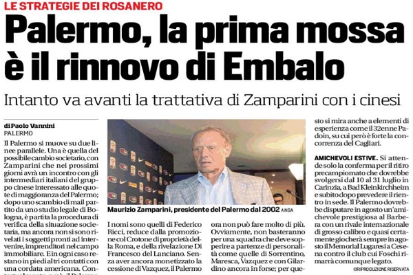 “Il Palermo si muove su due linee parallele. Una è quella del possibile cambio societario con Zamparini che nei prossimi giorni avrà un incontro con gli intermediari italiani del gruppo cinese interessato alle quote di maggioranza del Palermo; dopo uno scambio di mail partito da uno studio legale di Bologna, è partita la procedura di vanifica della situazione societaria, ma ancora non si sono rivelati i soggetti pronti ad intervenire, imprenditori nel campo immobiliare E in ogni caso restano in piedi altri contatti con una cordata americana. Contestualmente, però il Palermo lavora per il proprio organico con Foschi all’opera se non ufficialmente (sarà annunciato il 1 luglio alla scadenza del contratto col Cesena) almeno concretamente. RINNOVO EMBALO Ieri sono arrivati i primi segnali che almeno il club rosa è uscito dallo stallo: nella sede di viale del Fante ha firmato un rinnovo per altri 3 anni (fino al 2020) l’esterno guineano di passaporto portoghese Carlos Embalo, uno dei più brillanti nel suo ruolo nel recente campionato di serie B. Embalo, che ha giocato in prestito al Brescia era legato ai rosa solo fino al 2017 e sembrava destinato a partire viste anche le richieste dall’estero nei suoi confronti. Ma Foschi ha voluto fortemente che restasse a Palermo e proprio la presenza del ds ha rassicurato il procuratore del calciatore. il palermitano Beppe Accardi. Anche gli altri obiettivi di questa prima fase di mercato sono giocatori promettenti. I nomi sono quelli di Federico Ricci reduce dalla promozione col Crotone, di proprietà della Roma e della rivelazione Di Francesco del Lanciano. Senza aver ancora monetizzato la cessione di Vazquez il Palermo ora non può fare molto di più. Ovviamente non basteranno per una squadra che deve sopperire a partenze di personalità come quelle di Sorrentino, Maresca. Vazquez e con Gilardino ancora in forse; per questo si mira anche a elementi di esperienza come il 32enne Padoin, su cui però è forte la concorrenza del Cagliari”. Questo quanto si legge sull’edizione odierna de “Il Corriere dello Sport”.