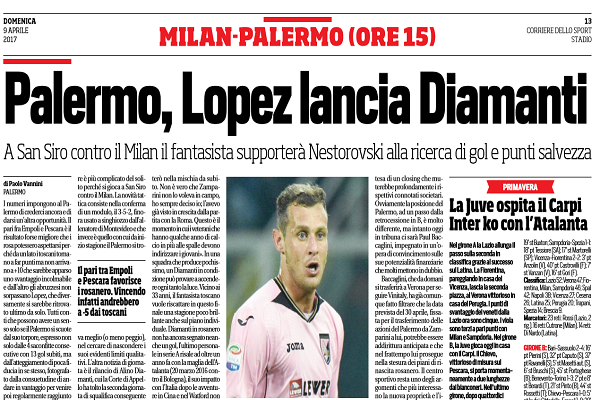 Corriere dello Sport: “Palermo, Lopez lancia Diamanti. A San Siro contro il Milan il fantasista supporterà Nestorovski alla ricerca di gol e punti salvezza”