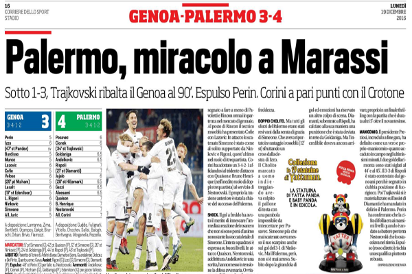 “É impossibile e, forse, anche un Palermo come quello ammirato a Marassi ieri sera non riesca a salvarsi. Eugenio Corini ha collezionato la sua prima vittoria dopo due sconfitte da quando ha preso il posto di De Zerbi. Il Palermo aveva incasellate dodici, ma ieri ha meritato il successo dopo essere grato in svantaggio anche sull’1-3 nella battaglia contro il Genoa. Solo il fenomenale Giovanni Simeone, praticamente da solo con due gol e un assist all’attivo stava per avere la meglio su un avversario indomito. Ma nel finale, con i Genoa in avanti di due gol, Corini ha trovato l’ispirazione giusta: cambi azzeccati (Diamanti su tutti), la carica di quando giocava. Una vittoria esaltante, capace di cambiare il campionato e la storia di questo Palermo”. Questo quanto si legge su “Il Corriere dello Sport”.