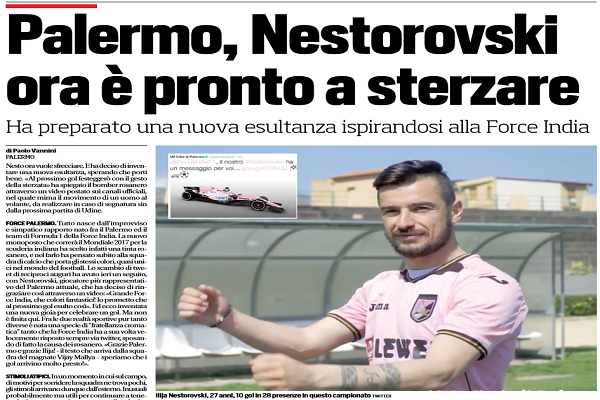 Corriere dello Sport: “Palermo, Nestorovski ora è pronto a sterzare. Ha preparato una nuova esultanza ispirandosi alla Force India”
