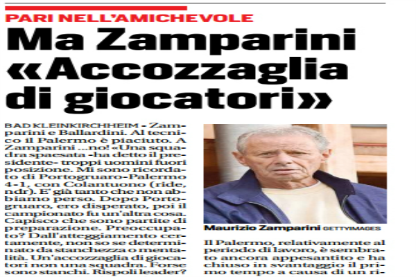 “Zamparini e Ballardini. Al tecnico il Palermo è piaciuto. A Zamparini …no! «Una squadra spaesata -ha detto il presidente- troppi uomini fuori posizione. Mi sono ricordato di Portogruaro-Palermo 4-1, con Colantuono (ride, ndr). E’ già tanto che non abbiamo perso. Dopo Portogruaro, ero disperato, poi il campionato fu un’altra cosa. Capisco che sono partite di preparazione. Preoccupato? Dall’atteggiamento certamente, non so se determinato da stanchezza o mentalità. Un’accozzaglia di giocatori non una squadra. Forse sono stanchi. Rispoli leader? Non voglio leader, voglio una squadra. Magari ne avessimo uno! I leader si chiamano Dybala, Vazquez, Cavani. Da salvare i giovani. Mi sono meravigliato di Struna mezzala, adesso chiederò all’allenatore. Probabilmente gli mancano i centrocampisti e ne ha inventato uno». Ballardini è di parere opposto: «Buon allenamento, in linea con i programmi. Cambi previsti per minuti giocati, non scelte tecniche. Struna a centrocampo? Bisognava far respirare Jajalo e Hiljemark. Struna però ha qualità fisiche e tecniche. E può giocare davanti alla difesa. Prestazione? Squadra ordinata e diverse palle gol, gli altri mai tirato in porta. I dati sono confortanti, poi ognuno ha le proprie opinioni». Il Palermo, relativamente al periodo di lavoro, è sembrato ancora appesantito e ha chiuso in svantaggio il primo tempo a causa di un rigore creato da Posavec su Felippé. Poi nella ripresa, ha pareggiato con Nestorovski e sfiorato ripetutamente il raddoppio. Questo ciò che si legge sull’edizione odierna de “Il Corriere dello Sport”.