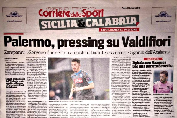 “L’input lo ha dato Zamparini: «Arriveranno due centrocampisti forti». È partita la caccia ai rinforzi per la linea mediana. Reparto che, soprattutto dopo la partenza di Maresca, ha bisogno di elementi di qualità. La ricerca di un regista occupa un posto rilevante nell’agenda del ds Foschi. Serve un giocatore che sappia dettare i tempi e con un bagaglio di esperienza importante da mettere al servizio del collettivo. Anche se Zamparini ha smentito l’indiscrezione, Valdifiori del Napoli non è sparito dai radar. La strada è decisamente in salita, ma il Palermo nutre ancora qualche speranza. Zamparini e De Laurentiis sono legati da ottimi rapporti di amicizia e questo aspetto potrebbe avere un peso sul tavolo delle trattative. In ogni caso, consapevoli delle difficoltà legate all’acquisto di Valdifiori, gli addetti ai lavori rosanero tengono in considerazione altri profilo. Uno di questi è Cigarini dell’Atalanta, un nome accostato a più riprese al Palermo nel recente passato. Il suo sponsor principale sarebbe Ballardini che ha allenato il play nerazzurro nelle giovanili del Parma e alla Sambenedettese”. Questo quanto si legge sull’edizione odierna de “Il Corriere dello Sport”.-