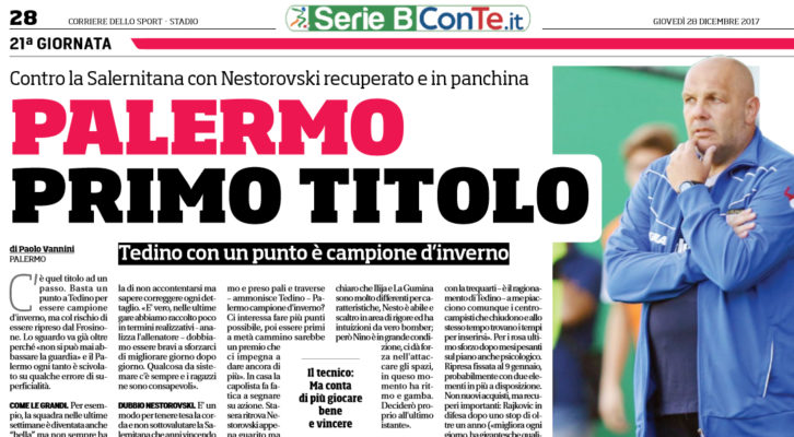 “C’è quel titolo ad un passo. Basta un punto a Tedino per essere campione d’inverno, ma col rischio di essere ripreso dal Frosinone. Lo sguardo va già oltre perché «non si può mai abbassare la guardia» e il Palermo ogni tanto è scivolato su qualche errore di superfi cialità. COME LE GRANDI. Per esempio, la squadra nelle ultime settimane è diventata anche “bella” ma non sempre ha sfruttato a dovere la superiorità sull’avversario. Con la Ternana, ha dovuto attendere il 90° per essere sicura dei 3 punti, a Cesena è stata rimontata dopo una prima mezzora francamente al limite della perfezione. E una qualità delle grandi è quella di non accontentarsi ma sapere correggere ogni dettaglio. «E’ vero, nelle ultime gare abbiamo raccolto poco in termini realizzativi – analizza l’allenatore – dobbiamo essere bravi a sforzarci di migliorare giorno dopo giorno. Qualcosa da sistemare c’è sempre e i ragazzi ne sono consapevoli». DUBBIO NESTOROVSKI. E’ un modo per tenere tesa la corda e non sottovalutare la Salernitana che anni vincendo al Barbera fa fece esonerare Silvio Baldini e che qui non perde dal 1995. «Ha appena cambiato allenatore (sulla panchina l’ex Colantuono, ndc) e non so che assetto presenterà. Viene da una sconfi tta in casa per 3-0 ma dopo aver giocato benissimo e preso pali e traverse – ammonisce Tedino – Palermo campione d’inverno? Ci interessa fare più punti possibile, poi essere primi a metà cammino sarebbe un premio che ci impegna a dare ancora di più». In casa la capolista fa fatica a segnare su azione. Stasera ritrova Nestorovski appena guarito ma che potrebbe non andare in campo dall’inizio: «Sta bene, oggi (ieri per chi legge, ndc) si è allenato, forse però non ha la condizione per reggere 90′. E neppure lui fa gol da solo, ci vuole sempre la squadra alle sue spalle. E’ chiaro che Ilija e La Gumina sono molto diff erenti per caratteristiche, Nesto è abile e scaltro in area di rigore ed ha intuizioni da vero bomber; però Nino è in grande condizione, ci dà forza nell’attaccare gli spazi, in queso momento ha ritmo e gamba. Deciderò proprio all’ultimo istante». IL NUOVO CORONADO. Così come per Chochev che ora si trova davanti non solo Gnahorè ma anche Coronado spostato a centrocampo. «Non cambia molto se Igor si sposta a destra o se c’è Trajkovski a cucire il gioco con la trequarti – è il ragionamento di Tedino – a me piacciono comunque i centrocampisti che chiudono e allo stesso tempo trovano i tempi per inserirsi». Per i rosa ultimo sforzo dopo mesi pesanti sul piano anche psicologico. Ripresa fi ssata al 9 gennaio, probabilmente con due elementi in più a disposizione. Non nuovi acquisti, ma recuperi importanti: Rajkovic in difesa dopo uno stop di oltre un anno («migliora ogni giorno, ha gigantesche qualità morali, gli siamo accanto») e Balogh in attacco: «Per lui sarà un po’ più diffi cile, è un ragazzo non abituato a subire infortuni: alla ripresa saranno in gruppo ma non so ancora con che capacità di essere disponibili per giocare»”. Questo quanto riportato dall’edizione odierna de “Il Corriere dello Sport”.