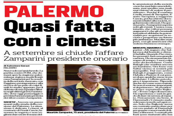 Corriere dello Sport: “Palermo, quasi fatta con i cinesi. A settembre si chiude l’affare, Zamparini presidente onorario”