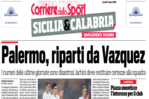 Corriere dello Sport: “Palermo, riparti da Vazquez. I numeri delle ultime giornate sono disastrosi, Iachini deve restituire certezze alla squadra. Tifosi rosanero a San Siro…”