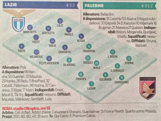 Questo pomeriggio alle ore 15 il Palermo targato Ballardini andrà di scena all’Olimpico contro la Lazio. Come si legge oggi su “Il Corriere dello Sport”, saranno ben cinque i cambi che saranno apportati dal neo-tecnico rispetto alla scorsa gara vinta contro il Chievo, quando in panchina sedeva ancora Beppe Iachini. Il primo riguarda la difesa con il ritorno dello schieramento a quattro e Goldaniga al fianco di Gonzalez, con Struna ad agire sulla fascia destra al posto di Rispoli. A centrocampo saranno ben due le novità: Jajalo in cabina di regia e Chochev a prendere la posizione di Hiljemark. Attacco composto da Vazquez, ad agire dietro le due punte, Gilardino e Trajkovski.
