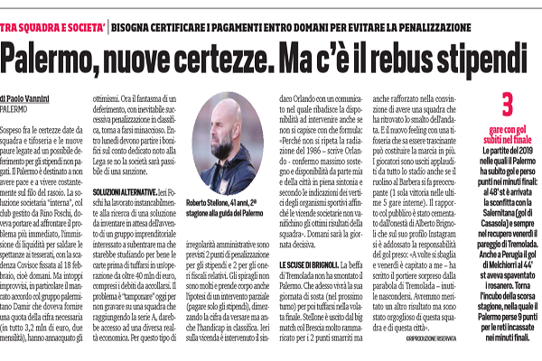 Il Palermo resta sospeso tra campionato ed extra calcio. Tra le certezze di una squadra e una tifoseria ritrovata e la paura di una penalizzazione in classifica. E’ questo ciò di cui scrive l’edizione odierna de “Il Corriere dello Sport”. “Il Palermo è destinato a non avere pace e a vivere costantemente sul filo del rasoio. – si legge – La soluzione societaria “interna”, col club gestito da Rino Foschi, doveva portare ad affrontare il problema più immediato, l’immissione di liquidità per saldare le spettanze ai tesserati, con la scadenza Covisoc fissata al 18 febbraio, cioè domani. Ma intoppi improvvisi, in particolare il mancato accordo col gruppo palermitano Damir che doveva fornire una quota della cifra necessaria (in tutto 3,2 mln di euro, due mensilità), hanno annacquato gli ottimismi. Ora il fantasma di un deferimento, con inevitabile successiva penalizzazione in classifica, torna a farsi minaccioso. Entro lunedì devono partire i bonifici sul conto dedicato noto alla Lega se no la società sarà passibile di una sanzione. […]”.