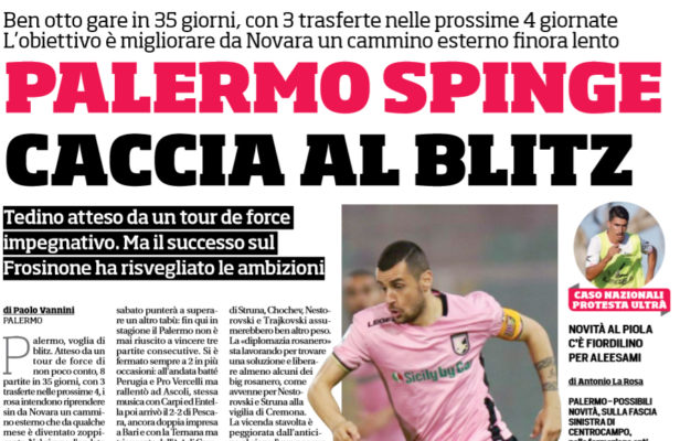 “Palermo, voglia di blitz. Atteso da un tour de force di non poco conto, 8 partite in 35 giorni, con 3 trasferte nelle prossime 4, i rosa intendono riprendere sin da Novara un cammino esterno che da qualche mese è diventato zoppicante. Nel girone d’andata il Palermo formato viaggio è stato travolgente e comunque imbattibile: 4 successi, 3 dei quali addirittura consecutivi (a Cremona, Avellino e Bari), nessuna sconfi tta tanto da far parlare di ruolino record. Ma a un certo punto la statistica si è improvvisamente rovesciata: in trasferta il Palermo non vince e non segna più ed è inciampato due volte. Nelle ultime 5 gare fuori casa appena 3 pareggi (a Cesena, Spezia e Vercelli) e i due ko di Empoli e Perugia. Nessun gol esterno nel 2018, l’ultimo lontano dal Barbera lo ha segnato Trajkovski a Cesena il 21 dicembre, poi sono passati 441′ e 4 trasferte intere senza bucare la porta avversaria. Per riprendere i primi due posti che valgono la serie A diretta bisogna spezzare questo digiuno.