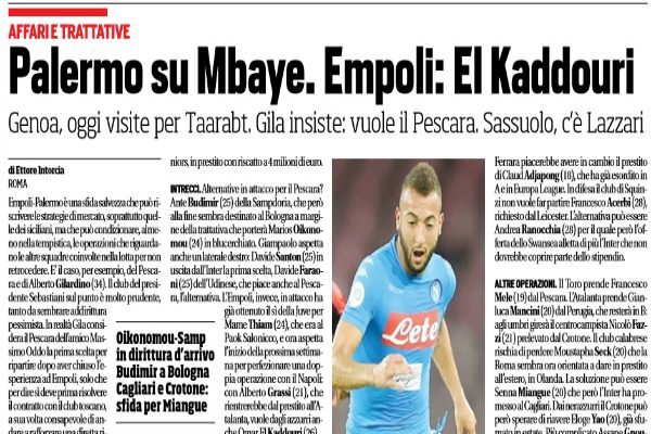Corriere dello Sport: “Palermo su Mbaye. Empoli: El Kaddouri. Gilardino va a Pescara – tutte le trattative del giorno in A”