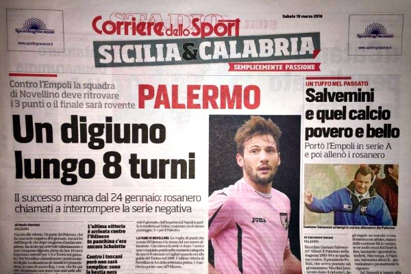 “Contro l’Empoli la squadra di Novellino deve trovare i tre punti o il finale sarà rovente. Il successo manca dal 24 gennaio: rosanero chiamati a interrompere la serie negativa”. Questo si legge sull’edizione odierna de “Il Corriere dello Sport”. Il quotidiano poi prosegue: “Caccia alla vittoria. Da parte del Palermo, che ha una serie negativa di 8 giornate, ma anche dall’Empoli, che dopo un girone d’andata strepitoso, ha avuto un notevole rallentamento e non conquista la posta piena da ben 10 turni. Per Novellino naturalmente i punti scottano di più. La situazione di classifica è pesantissima, in caso di nuovo flop, i rosa, che fin qui nel campionato non sono mai stati nelle ultime tre posizioni, rischiano di ritrovarsi sorpassati già domenica dal Frosinone o dal Carpi […]”