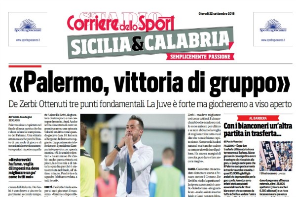 “Palermo cinico e spietato nel finale di una partita che ha ridato la luce al campionato del Palermo. Una vittoria ottenuta anche perché frutto di una mole di gioco e di occasioni da rete sicuramente superiori rispetto a quelle create dall’Atalanta. De Zerbi è stato bravo a vincere la partita nel secondo tempo, così come domenica scorsa era stato bravo a raddrizzare il risultato contro il Crotone. Fra l’altro il Palermo è cresciuto nel secondo tempo, così come l’Atalanta ha denunciato un calo piuttosto evidente nella ripresa. Domenica al «Barbera» è attesa la Juventus. GIOIA. La prima vittoria non si scorda mai. A maggior ragione se viene conquistata in Serie A dove De Zerbi, da giocatore c’è stato poco e non certo per demerito. Anzi. Anche ieri ha dimostrato di avere un grande acume, una spiccata velocità intuitiva come quando giocava da n. 10. Ieri sera a Bergamo Roberto era raggiante. L’appuntamento telefonico con il presidente Zamparini è previsto per questa mattina. «Sì, lo sentirò volentieri – ha ammesso De Zerbi – anche questa vittoria mi piace, la sento mia e di tutta la squadra perché è stata ottenuta nel finale, all’ultimo minuto. Perché io e la squadra l’abbiamo voluta, a tutti i costi». UMILTÀ. De Zerbi chiede sempre ai suoi giocatori il massimo. «Umiltà e disponibilità su tutto – ha spiegato il tecnico perchè io le partite voglio giocarmela, sempre e fino in fondo. I miei giocatori sono tecnici, abili nel gestire il pallone. Ci tengono a dare il massimo. Non vogliono solo difendersi. Se c’è da osare, si osa». Adesso arriva la Juventus. Sabato al «Barbera» si prevede una grande festa. Ma De Zerbi almeno ieri sera era un po’ preoccupato. «Siamo contati, siamo in pochi – ha detto – abbiamo molti infortunati. Ma non vogliamo partire battuti, non sarebbe giusto. La Juventus è sicuramente la squadra più forte del campionato, ma noi faremo il possibile per contrastarla». Il tecnico si aspetta una grande prova di maturità dalla sua squadra contro la Juventus. «Dobbiamo affrontarla a viso aperto – ha garantito – anche perché in queste occasioni possiamo forgiare la giusta mentalità. Se ci abituiamo a giocare sempre senza paura, potremo fare sempre meglio». SUPER-BOMBER. L’attaccante macedone Nestorovski può considerarsi una vera e propria sorpresa, anche perché le sue credenziali non sembravano così pregiate. «Ha voglia, ha fame, ha voglia di imporsi – ha assicurato De Zerbi – ma deve migliorare così come tutti noi. E ci mancherebbe che non fosse così. Io sono arrivato per ultimo e se non abbiamo la voglia di migliorarci in tutto vuol dire che non abbiamo capito niente. Nestorovski ha doti naturali ma è anche scaltro sa sempre dove finisce il pallone. Ha ancora margini di crescita, può dare e fare ancora meglio». CAMBI. Così come era accaduto domenica scorsa a Pescara contro il Crotone, De Zerbi ha risolto la partita nella ripresa azzeccando i cambi. «Solo fortuna – si è giustificato – ma ho voluto inserire Jajalo e Gazzi non per difendere ma per gestore la palla. Noi non abbiamo contropiedisti, dobbiamo giocare con pochi tocchi ma molto precisi. Jajalo e Gazzi hanno avuto una gestione del gioco eccezionale che è stata la chiave decisiva per sostare in avanti il baricentro del nostro gioco. Lì è cambiato l’equilibrio della partita»”. Questo quanto si legge sull’edizione odierna de “Il Corriere dello Sport” in merito alle parole rilasciate da De Zerbi al termine di Atalanta-Palermo.