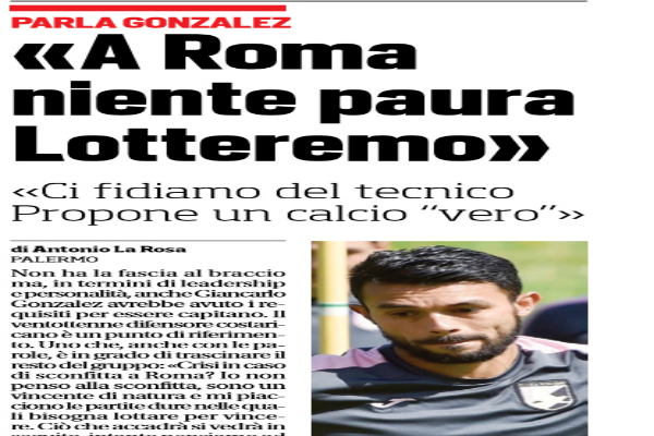 “Non ha la fascia al braccio ma, in termini di leadership e personalità, anche Giancarlo Gonzalez avrebbe avuto i requisiti per essere capitano. Il ventottenne difensore costaricano è un punto di riferimento. Uno che, anche con le parole, è in grado di trascinare il resto del gruppo: «Crisi in caso di sconfitta a Roma? Io non penso alla sconfitta, sono un vincente di natura e mi piacciono le partite dure nelle quali bisogna lottare per vincere. Ciò che accadrà si vedrà in seguito, intanto pensiamo ad entrare in campo con un atteggiamento propositivo. La Roma (avversaria domenica all’Olimpico, ndr) è una squadra forte e con tanta qualità ma anche noi abbiamo i nostri punti di forza. Giocheremo con umiltà ma non deve mancare la voglia di combattere». Il numero 12 rosanero dispensa pillole di ottimismo: «Il terzultimo posto non mi preoccupa. In questo momento non penso neanche alla salvezza perché sono concentrato su ogni singola partita. Sono convinto che i risultati arriveranno. Stiamo lavorando bene e, prima o poi, raccoglieremo i frutti di questo lavoro». Nuovo Capitolo. Il Gonzalez che, a causa delle voci di mercato, all’inizio della stagione ha vissuto tra le mura rosanero quasi da separato in casa è ormai un lontano ricordo. Terminata la sessione estiva, Giancarlo ha disfatto le valigie e si è risintonizzato subito sulle frequenze rosanero: «Da quando ho firmato, ho sempre pensato solo al Palermo e non sono cambiato. Sono rimasto lo stesso Pipo, con tanta voglia di dare il massimo per questa squadra». Ma chi è il vero Gonzalez? Il difensore, adattabile a più ruoli («Preferisco agire da centrale ma gioco con piacere anche a destra o a sinistra»), l’anno scorso non ha confermato gli standard di rendimento del 2014/15. «Il primo anno è andato bene e anche nella passata stagione non credo di aver fatto male avendo giocato, peraltro, 35 partite. Detto questo, devo fare di più e continuare a lavorare cercando sempre di migliorare. E il ragionamento vale anche se non sono titolare». Con De Zerbi, in ogni caso, Pipo avrà sempre una grossa fetta di visibilità: «Lo ringrazio per la fiducia. È un professionista con un’idea di gioco moderna e siamo molto contenti dei suoi metodi. Dobbiamo continuare su questa strada, il suo è un calcio ‘vero’ in cui bisogna portare la palla pulita al compagno. Il ko con il Torino? Penso che abbiamo fatto una buona gara da un punto di vista tattico, per applicare questa nuova idea di calcio c’è bisogno di tempo e gli errori ci stanno». In occasione della rete di Chochev, la squadra ha esultato in maniera particolarmente gioiosa: «È uno che dà tutto ed è un piacere condividere la gioia del gol con giocatori del genere. Nestorovski? Dobbiamo metterlo nelle condizioni di segnare ancora di più».”. Questo quanto si legge sull’edizione odierna de “Il Corriere dello Sport”.