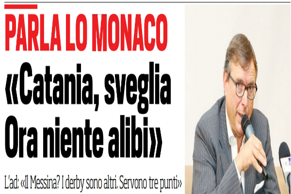 Corriere dello Sport: “Parla Lo Monaco: «Catania, sveglia. Ora niente alibi». L’ad: «Il Messina? Per noi il derby è solo quello contro il Palermo. Servono tre punti»”