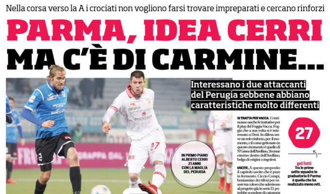 “Si apre il mercato e il Parma fin dalle prossime ore cercherà di piazzare un colpo in attacco per provare a regalare a D’Aversa un nuovo bomber. Perché, senza girarci intorno, il problema di una squadra che da neopromossa è comunque quinta a quattro punti dalla seconda, è stato, nelle prime 21 giornate, il gol. Attaccanti infortunati, altri che lottano corrono ma segnano poco, altri ancora che tendono a fallire le occasioni, centrocampisti che concludono poco e male. In questo panorama poco esaltante nelle prime dieci giornate ci hanno pensato i difensori sfruttando la ricchezza degli schemi su calcio piazzato a tenere a galla la squadra. Dopo sono arrivati i gol su azione ma sempre con grande parsimonia. Ecco allora che il diesse Faggiano sta esplorando le soluzioni per far lievitare il rendimento offensivo. Potrebbe anche puntare non tanto su un bomber in assoluto, come aveva fatto in agosto trattando a lungo con Caputo. Ma su un centravanti che sappia integrarsi nel gioco della squadra e magari esaltare le doti dei compagni. Nel primo caso il nome potrebbe essere quello di Di Carmine, o anche di Matri, vicinissimi in agosto ai colori crociati, nel secondo invece spunta l’identikit di Alberto Cerri. Il ragazzo, classe 1996, sarebbe ancora in quota under pur avendo ormai una certa esperienza. E’ di Parma, per la precisione di San Secondo Parmense, e nel Parma è cresciuto calcisticamente sino al debutto in serie A. Ma soprattutto ha prestanza fi sica e visione di gioco: nella prima metà della stagione nel Perugia ha segnato pochino, quattro gol di cui due dagli undici metri, ma ha fornito ben sette assist gol ai compagni, in particolare a Di Carmine. Il suo sarebbe il profilo ideale, ma c’è un ma. A Parma si è soliti fare le cose in grande e la sensazione della piazza in queste ore è che la società stia pensando a un grosso nome, a un bomber di valore assoluto che, inserendosi con effi cacia nell’impianto della squadra che vanta già la miglior difesa della B, possa imprimere quell’accelerata in grado di ricomporre il divario che attualmente separa i crociati dalle prime posizioni.”