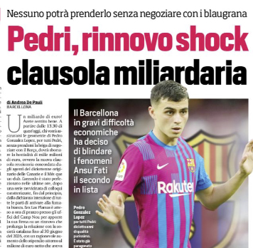Un miliardo di euro! Avete sentito bene. A partire dalle 13.30 di quest’oggi, chi vorrà assicurarsi le geometrie di Pedro Gonzalez Lopez, per tutti Pedri, senza prendersi la briga di negoziare con il Barça, dovrà sborsare la bestialità di mille milioni di euro, ovvero la nuova clausola rescissoria concordata dagli agenti del diciottenne originario delle Canarie e il Més que un club. L’accordo è stato perfezionato nelle ultime ore, dopo una serie ravvicinata di colloqui caratterizzate, fin dal principio, dalla dichiarata intenzione di tutte le parti di arrivare alla fumata bianca. L’ex Las Plamas è atteso a ora di pranzo presso gli uffici del Camp Nou per apporre la sua firma su un rinnovo che prolunga la relazione con la società catalana fino al 30 giugno del 2026, con un ragionevole aumento dello stipendio attorno al milione di euro netto che aveva percepito nella sua prima stagione in blaugrana.