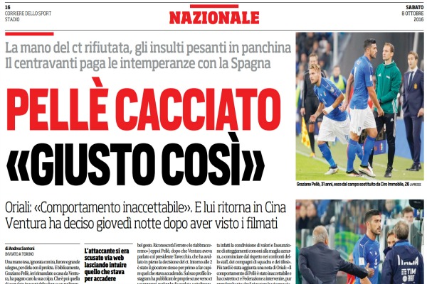 Corriere dello Sport: “Pellè cacciato, «Giusto così». Oriali: «Comportamento inaccettabile»”