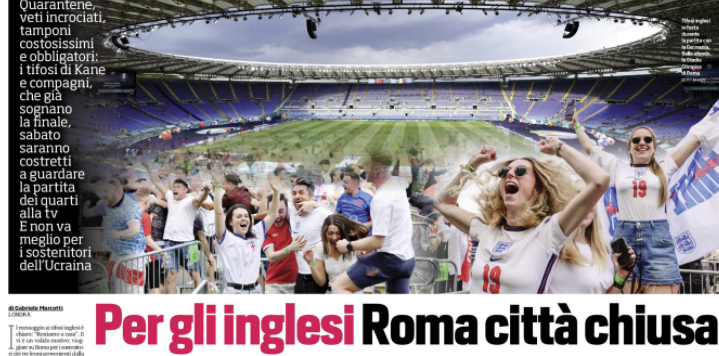 L’edizione odierna del “Corriere dello Sport” si sofferma sul divieto di accesso a Roma per i tifosi che verranno dall’Inghilterra.