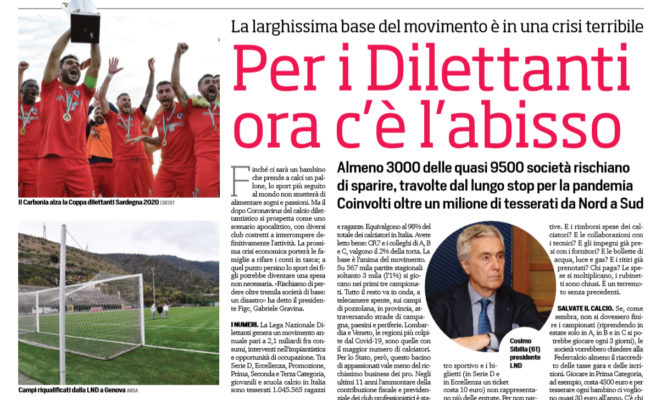Corriere dello Sport: “Per i Dilettanti ora c’è l’abisso. Almeno 3000 delle quasi 9500 società rischiano di sparire, travolte dal lungo stop per la pandemia. Coinvolti oltre un milione di tesserati da Nord a Sud”