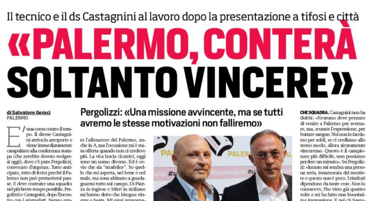 L’edizione odierna del “Corriere dello Sport” si sofferma sulle dichiarazioni di Pergolizzi e Castagnini. L’allenatore afferma: «Per anni ho inseguito il sogno di allenare il Palermo, anche in A, ma l’occasione mi è stata offerta quando non ci credevo più. E’ ovvio che sia strafelice. Di Piazza in inglese e Mirri in siciliano mi hanno detto che bisogna vincere e basta. Mi sarei vergognato a chiedere un contratto di due anni, parleranno i risultati. Non penso a grandi nomi, ma solo a calciatori in grado di dare tutto. E’ necessario sacrificarsi e avere rispetto degli avversari». Parola al direttore sportivo: «Abbiamo fretta, starò a Palermo fisso, non mi muovo, bisogna lavorare ventiquattro ore. Stiamo costruendo la squadra in dieci giorni, un record. Non possiamo sbagliare, soprattutto nella scelta dei giovani, altrimenti salterà tutto in aria. Tutti devono venire a Palermo per buttare sangue. Pergolizzi è una persona innamorata del mestiere, mi ha fatto una grande impressione. Sagramola è fantastico, ho lavorato con lui tanti anni ed è una garanzia».