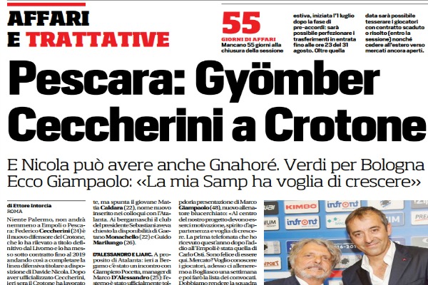 Corriere dello Sport: “Pescara: Gyömber. Ceccherini a Crotone. E Nicola può avere anche Gnahoré. Verdi per Bologna. Ecco Giampaolo: «La mia Samp ha voglia di crescere»”
