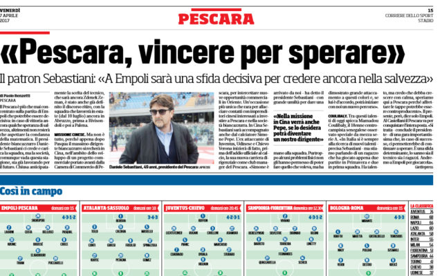 Corriere dello Sport: “«Pescara, vincere per sperare». Il patron Sebastiani: «A Empoli sarà una sfida decisiva per credere ancora nella salvezza»”