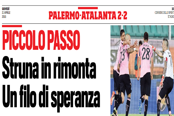 “Nella cornice surreale di un Barbera vuoto con le voci dei calciatori e il tifo delle panchine a rimbombare in continuazione, il Palermo non va oltre un pari in rimonta contro un’Atalanta paga del campionato svolto e che ha sofferto anch’essa le strane condizioni di gioco. Il risultato serve poco ad una squadra che non vince da 13 giornate e che aveva bisogno di un’iniezione di fiducia per credere ancora nella salvezza. La verità è che il Palermo (rimasto penultimo in classifica) è svuotato e non ha mai superato i propri limiti tecnici e caratteriali che sono evidenti sin dalle prime giornate. Neppure aver fatto gol dopo 100″ gli è servito per gestire una partita in discesa. Il rigore (primo dell’anno) segnato da Vazquez è stato velocemente pareggiato da Borriello anch’egli dal dischetto, per un fallo sciocco di Struna su Gomez. Almeno lo sloveno, uno dei giocatori più discussi di questa travagliata annata rosa, ha risolto la mischia a un quarto d’ora dalla fine che ha permesso al Palermo di non perdere l’ennesima gara interna. Rivoluzione. Ballardini ha operato l’ennesima rivoluzione riproponendo giocatori in cui evidentemente crede nonostante le tante bocciature dei mesi precedenti. Con l’eccezione di Lazaar, al cui posto viene data fiducia al 18enne Pezzella, è in pratica la stessa formazione che all’andata regalò al tecnico la sonante vittoria sul Frosinone. Djurdjevic (in tribuna a Torino) centravanti al posto di Gilardino, Trajkovski alle sue spalle, Struna rispolverato in difesa dove però c’è anche Vitiello utilizzato da centrale in luogo dello squalificato Goldaniga. In mezzo al campo Jajalo vince una volta di più il ballotaggio con Maresca e non c’è neppure Brugman, che parte in panchina. Per Reja mini turn over, con Borriello in campo e Diamanti in panchina. L’inizio sembra confortante perchè il Palermo va in vantaggio alla prima azione: Bellini ferma con la mano il colpo di testa di Chochev e ai rosa viene concesso il primo rigore della stagione. Ma il vantaggio di Vazquez e il morale che potrebbe derivarne alla squadra dura pochissimo: Struna stronca Gomez involatosi sulla fascia con un intervento troppo rude in cui oltre alla palla prende il piede dell’avversario. E col pari di Borriello (terzo gol in 3 giorni), i rosa devono ricominciare daccapo. Le particolari condizioni del match incidono sul ritmo della gara. Il Palermo prova a pressare ma all’Atalanta basta raddoppiare con intensità su Vazquez per controllare la pericolosità dei rosanero. Ed è anzi Raimondi (un ex) a mettere paura a Sorrentino con due incursioni dalla destra dove prevale sul baby Pezzella. palle inattive. Il Palermo si butta dentro nella ripresa col cuore e poco altro, ma continua a prendere gol assurdi per una squadra che deve lottare. Su una punizione dalla trequarti di Cigarini, Paletta salta liberissimo di testa e segna. Ennesimo gol preso su disaattenzione da palla inattiva. Ballardini, che nell’intervallo recupera Gilardino per l’imbarazzante Djurdjevic, tenta il tutto per tutto togliendo un centrocampista per inserire Quaison e fra affollamento di mezzepunte e pressione dettata dalla disperazione, il Palermo almeno trova il pari con Struna che risolve una mischia scaturita da una punizione. L’Atalanta avrebbe spazi per affondare, ma è molle e così è Jajalo a sprecare al 40′ l’occasione per il 3-2 s una corta respinta di Sportiello successiva ad altro calcio piazzato di Trajkovski (l’unica volta in cui il macedone giustifica la sua presenza in campo). E sono piuttosto gli ospiti a sfiorare il successo con Gomez che se ne va solo soletto proprio al 90′ ed è bloccato da Vitiello che prende il rosso e poi con Freuler che nel recupero mette al lato in spaccata. Per l’Atalanta un punticino utile a non rischiare più, per il Palermo incapace di vincere la certificazione della propria mediocrità. Domenica c’è lo spareggio di Frosinone, davvero ultima chance per evitare il tracollo”. Questo il commento dell’odierna edizione de “Il Corriere dello Sport” in merito alla partita andata in scena ieri sera al “Renzo Barbera” tra Palermo ed Atalanta.