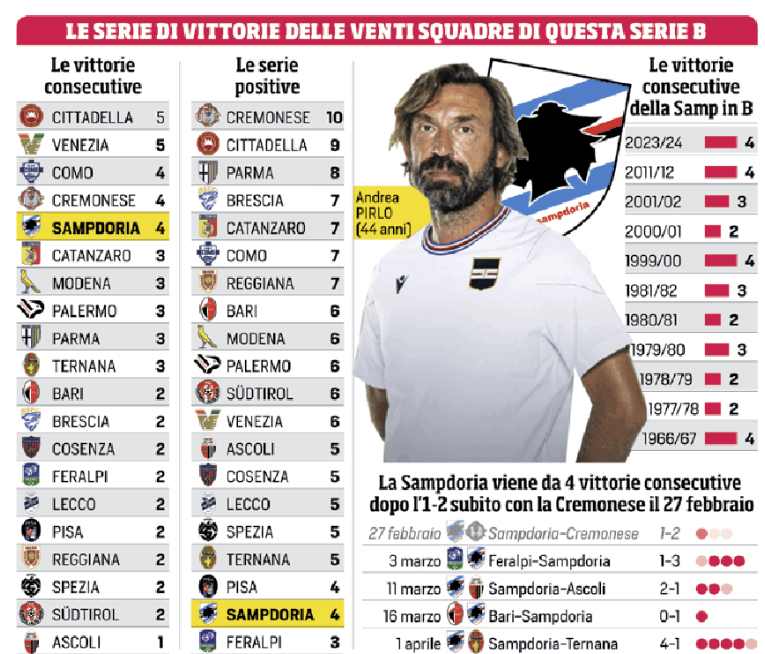 A Palermo, dunque, Pirlo può entrare nella storia della Samp. Ma in B possiamo trovare anche ben 9 vittorie di fila, ma nel 1940/41 la squadra aveva un altro nome, la Liguria. Tra la 6ª e la 14ª d’andata 2-1 all’Alessandria, 3-2 a Vercelli, 4-1 al Pisa, 3-1 a Lucca, 3-2 all’Udinese, 2-1 a Reggio Emilia, 3-0 all’Anconitana, 3-1 a Brescia e 3-0 al Padova.