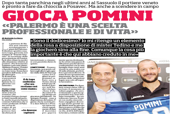 “PUZZLE COMPLETO. Gli addetti ai lavori rosanero, che in pratica hanno riempito tutti i tasselli del puzzle, anche in porta hanno centrato l’obiettivo che si erano prefissati: il Palermo aveva bisogno di un portiere che potesse fare da chioccia al titolare Posavec e questo “dodicesimo” di esperienza è arrivato. Il profilo è quello del trentaseienne Alberto Pomini. Portiere pronto a supportare il processo di crescita del giovane croato ma per nulla intenzionato a rimanere con passività dietro le quinte. COMPETIZIONE – Posavec, insomma, non potrà cullarsi sugli allori e già a partire dalla sfida di Tim Cup contro il Cagliari in programma sabato sera a Torino dovrà lottare per difendere il posto nell’undici titolare. «Sono il dodicesimo? Io mi ritengo un giocatore del Palermo – ha spiegato Pomini – sono a disposizione del mister. E’ giusto che la società provi a dare fiducia a Posavec ma io cercherò ugualmente di dare il massimo per questa maglia. E’ una sfida nuova e la affronto con grande entusiasmo.SCELTA DI VITA. Il trasferimento a Palermo dopo tredici anni al Sassuolo rappresenta una scelta anche di vita: «Prima di accettare definitiva mente questa destinazione ho avuto una pausa di riflessione perché dovevo confrontarmi con la mia famiglia dopo tanti anni vissuti in una realtà con 30 mila abitanti, pochi tifosi e pressioni diverse. Si tratta di uno spostamento importante che ha comportato delle valutazioni legate non solo all’aspetto lavorativo». […]”.